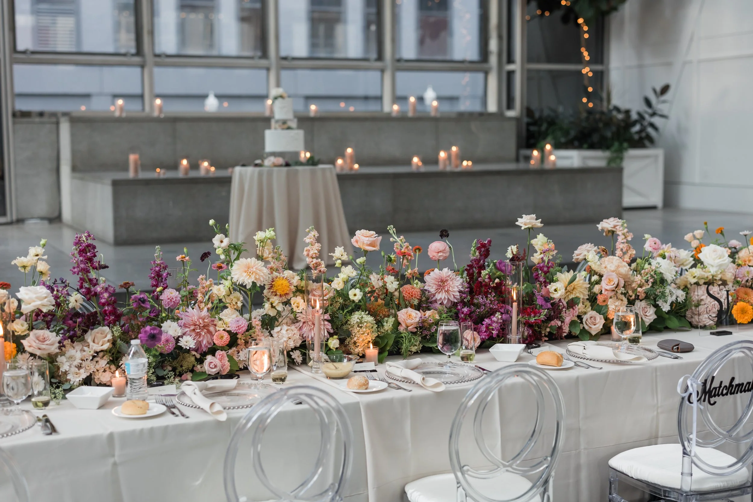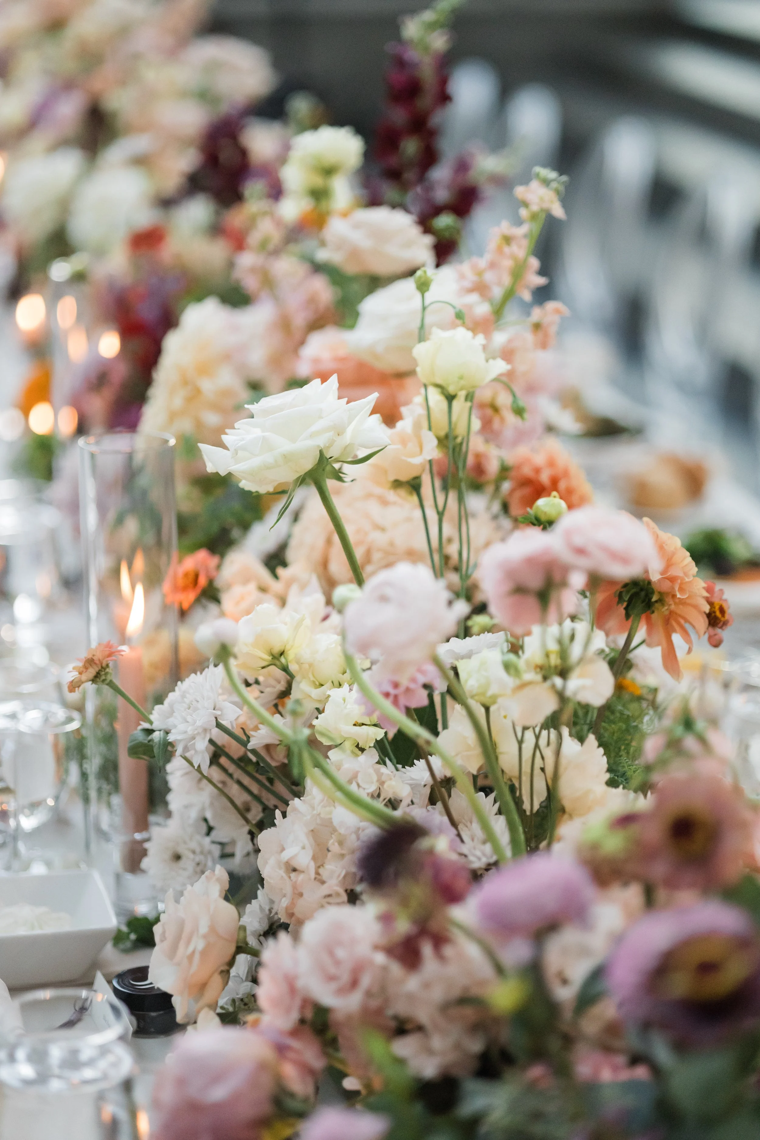 Floor to Ceiling glass windows as a backdrop to lush, colorbloced florals running throughout the entire wedding.
